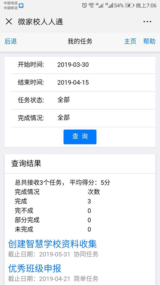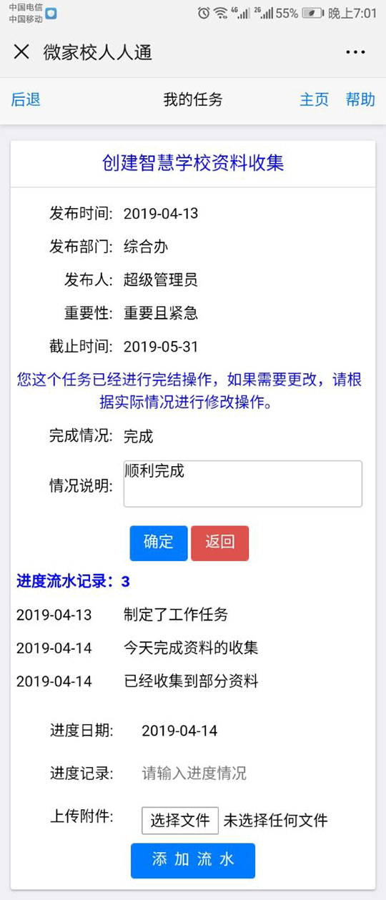 5、完结任务 进入“我的任务”可以查询所有任务的完成情况。当发现某个未完成的任务后,需要在“我的任务”中对任务进行完结操作,并进行简明扼要的说明。如果未按进度完成则可能会收到发布人发过来的微信提示。