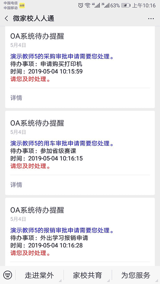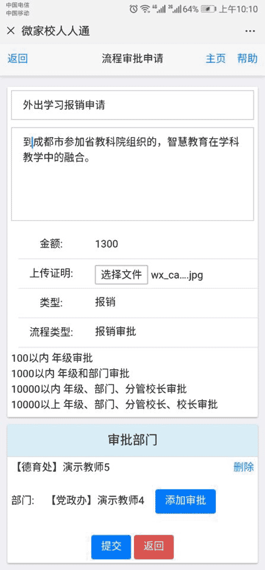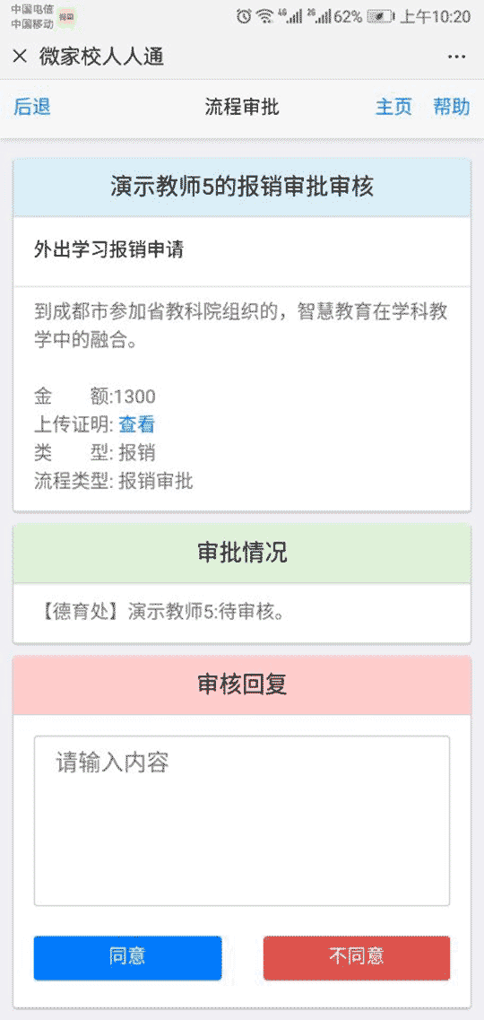 1、发起审批 教师根据需要在系统找到对应的如请假、采购、调课等各种申请、审批;系统自动显示出审批制度、涉及部门数量及具体部门;教师选择具体部门,输入原因后,系统自动向相关责任人发出审批申请。